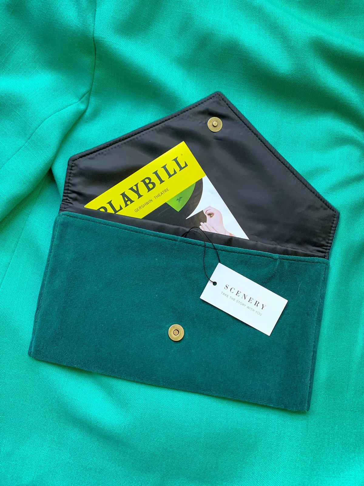 Size: 12" x 6.5" envelope clutch with a 9" x 6" pocket sized to hold your Playbill.
